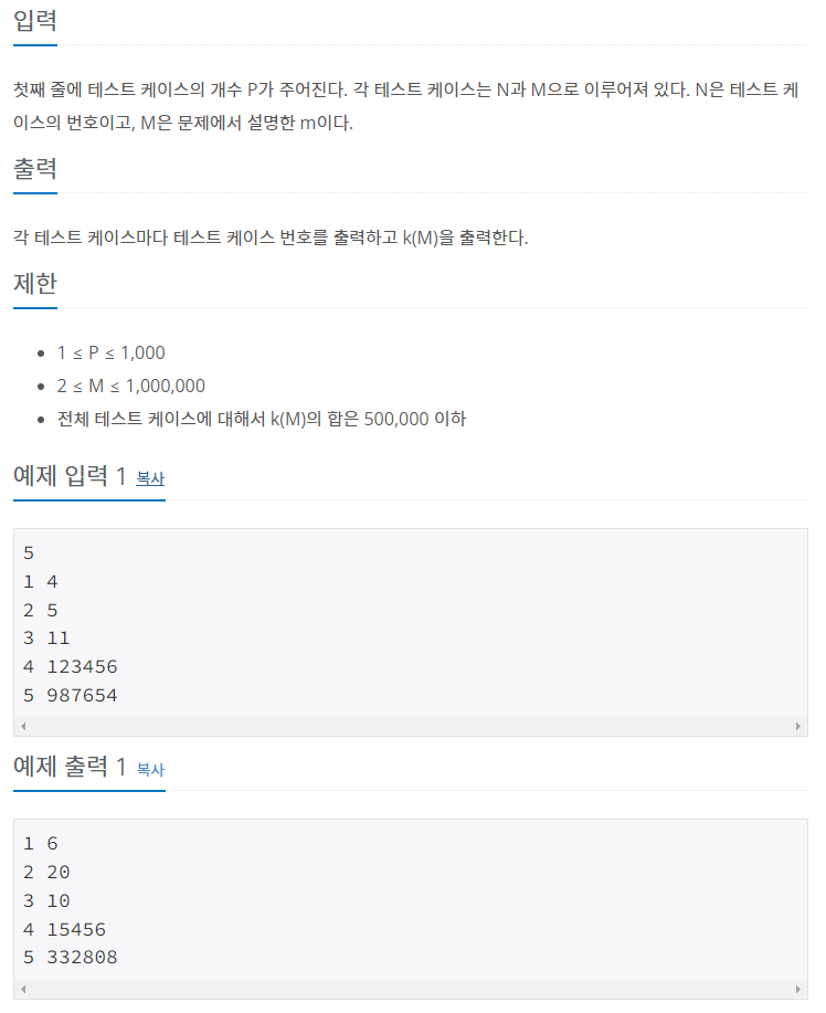 시간 제한메모리 제한제출정답맞은 사람정답 비율1 초128 MB28321518681.938% 문제1960년, IBM의 직원 Donald Wall은 피보나치 수열을 m으로 나눈 나머지가 주기를 이룬다는 것을 증명했다.예를 들어, 피보