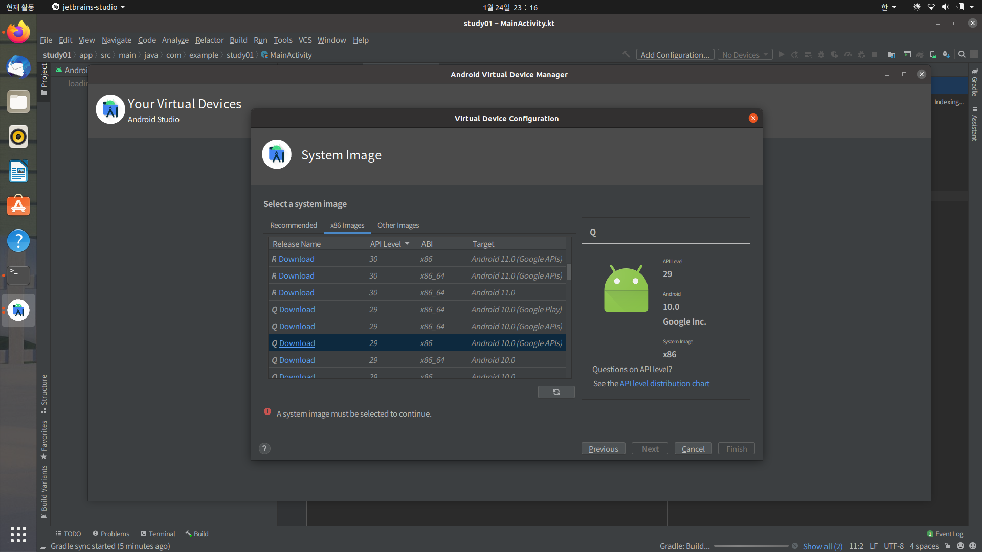 api29, x86, android 10.0 다운로드하고 선택한 후에 next