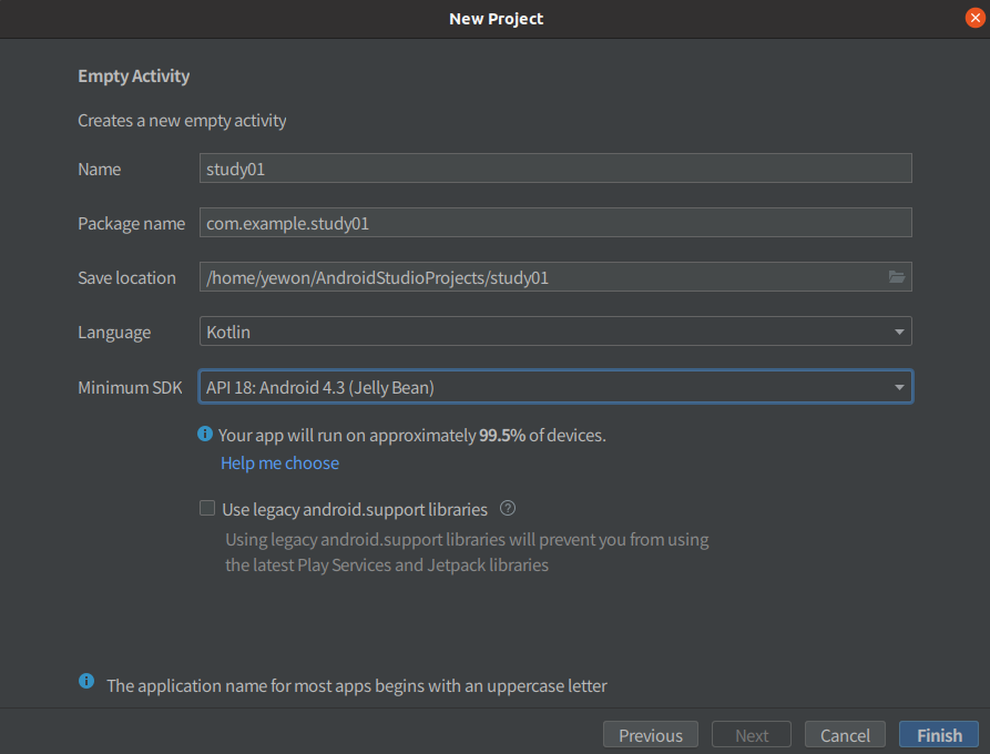 minimum sdk는 디폴트가 롤리팝이었는데 난 그냥 젤리빈으로 설정함
